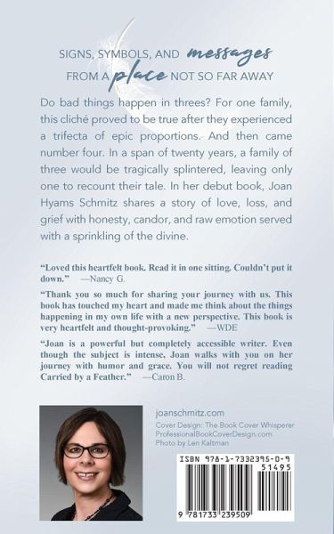 Do bad things happen in threes? For one family, this cliché proved to be true after experiencing a trifecta of epic proportions. And then came number four. In a span of twenty years, a family of three would be tragically splintered, leaving only one to recount their tale. In her debut book, Joan Hyams Schmitz shares a story of love, loss, and grief with honesty, candor, and raw emotion served with a sprinkling of the divine. She credits her ability to tap into her reservoir of resilience and inner strength to a few feathered friends, a handful of tenets, a unique club, and signs, symbols, and messages from a place not so far away. Ride along with one family’s journey that reiterates and reinforces the fact we all have a story and it’s worth sharing. By sharing our stories, we reveal our interconnectedness and the fact we’re never really alone as we traverse this thing called life.