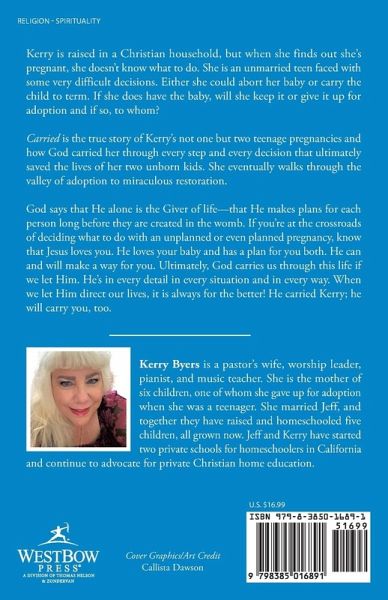 Kerry is raised in a Christian household, but when she finds out she's pregnant, she doesn't know what to do. She is an unmarried teen faced with some very difficult decisions. Either she could abort her baby or carry the child to term. If she does have the baby, will she keep it or give it up for adoption and if so, to whom? Carried is the true story of Kerry's not one but two teenage pregnancies and how God carried her through every step and every decision that ultimately saved the lives of her two unborn kids. She eventually walks through the valley of adoption to miraculous restoration. God says that He alone is the Giver of life-that He makes plans for each person long before they are created in the womb. If you're at the crossroads of deciding what to do with an unplanned or even planned pregnancy, know that Jesus loves you. He loves your baby and has a plan for you both. He can and will make a way for you. Ultimately, God carries us through this life if we let Him. He's in every detail in every situation and in every way. When we let Him direct our lives, it is always for the better! He carried Kerry; he will carry you, too.