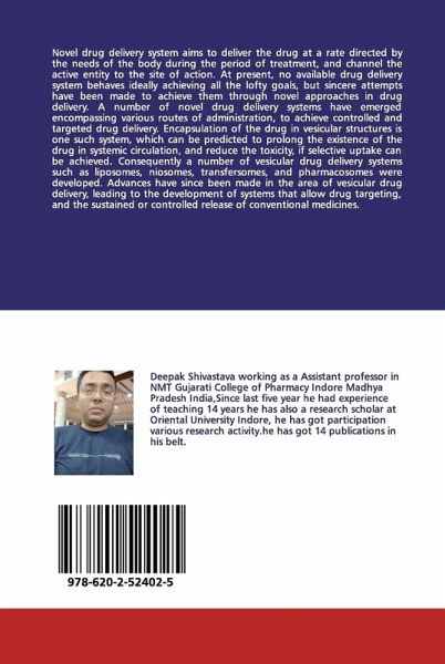 Novel drug delivery system aims to deliver the drug at a rate directed by the needs of the body during the period of treatment, and channel the active entity to the site of action. At present, no available drug delivery system behaves ideally achieving all the lofty goals, but sincere attempts have been made to achieve them through novel approaches in drug delivery. A number of novel drug delivery systems have emerged encompassing various routes of administration, to achieve controlled and targeted drug delivery. Encapsulation of the drug in vesicular structures is one such system, which can be predicted to prolong the existence of the drug in systemic circulation, and reduce the toxicity, if selective uptake can be achieved. Consequently a number of vesicular drug delivery systems such as liposomes, niosomes, transfersomes, and pharmacosomes were developed. Advances have since been made in the area of vesicular drug delivery, leading to the development of systems that allow drugtargeting, and the sustained or controlled release of conventional medicines.