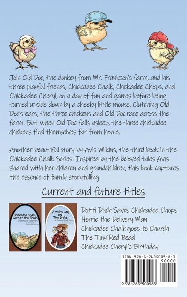 Dive into a delightful adventure with Chickadee Chalk and his siblings, Chickadee Chops and Chickadee Cheryl, as they are visited by one of their favorite playmates, Old Doc the donkey. Join them for a day of fun and games when a cheeky little mouse gives Old Doc a bit of a fright. As Old Doc gallops across the farm, Chickadee Chalk, Chickadee Chops, and Chickadee Cheryl, clinging to Old Doc's ears, find themselves far from home. "Carrots à la Hee-Haw" is the third installment in the beloved Chickadee Chalk Series by Avis Wilkins. Inspired by the cherished tales Avis shared with her children and grandchildren, this heartwarming story captures the magic of family storytelling. Perfect as a bedtime story and a delight to read for all ages.