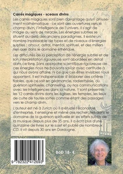 Les carrés magiques sont bien davantage qu'un jeu mathématique - ce sont des ouvertures vers le champ mystique, l'univers, le divin. Il s'agit de magie au sens de mirecle. Les énergies subtiles ne se situent pas dans la gamme de fréquences des anciens paradigmes. Il existe un nombre insaisissable de types et de niveaux d'énergies subtiles: amour, astral, mental, spirituel, et des milliers rien que dans le domaine éthérique.Les difficultés de la perception de l'énergie subtile et son interprétation rigoureuse sont abordées en détail dans ce livret. Sans approche scientifique de ces énergies nous ne pouvons savoir avec certitude à qui nous avons à faire, ni ce que ces êtres invisibles nous apportent. Il est indispensable de nous pencher sur la rigueur et des critères fiable, que ce soit en géomancie, radiesthésie, guérison spirituelle, channeling, nos communications avec les intelligences dans la nature. Y sont présentés les 12 carrés mystiques dans les églises, les temples, les lieux de culte de toutes sortes comme des passages vers le champ divin.