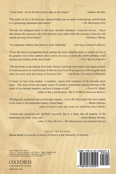 In addition, the development of an extensive local trade meant that the domestic trade, in all its configurations, was a prominent feature in southern life. Yet, this indispensable part of the slave system also raised many troubling questions. For those outside the South, it affected their impression of both the region and the new nation. For slaveholders, it proved to be the most difficult part of their institution to defend. And for those who found themselves commodities in this trade, it was something that needed to be resisted at all costs. "Carry Me Back" restores the domestic slave trade to the prominent place that it deserves in early American history, exposing the many complexities of southern slavery and antebellum American life.
