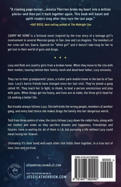 CARRY ME HOME is a fictional novel inspired by the true story of a teenage girl's involvement in several Mexican gangs in San Jose and Los Angeles. The members of her crew call her, Guera, Spanish for "white girl" and it doesn't take long for her to get lost in their world of guns and drugs. Lucy and Ruth are country girls from a broken home. When they move to the city with their mother, leaving behind their family ranch and a dead-beat father, Lucy unravels. They run to their grandparents' place, a trailer park mobile home in the barrio of San Jose. Lucy's barrio friends have changed since her last visit. They've joined a gang called VC. They teach her to fight, to shank, to beat a person unconscious and play with guns. When things get too heavy, and lives are at stake, the three head for LA seeking a better life. But trouble always follows Lucy. She befriends the wrong people, members of another gang, and every bad choice she makes drags the family into her dangerous world. Told from three points of view, the story follows Lucy down the rabbit hole, along with her mother and sister as they sacrifice dreams and happiness, friendships and futures. Love is waiting for all of them in LA, but pursuing a life without Lucy could mean losing her forever. Ultimately it's their bond with each other that holds them together, in a true test of love, loss and survival.