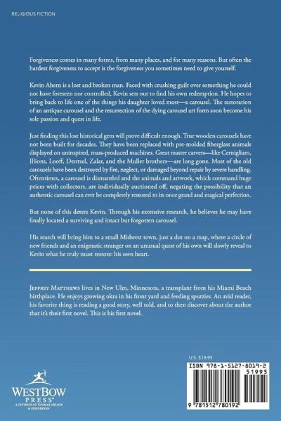 Forgiveness comes in many forms, from many places, and for many reasons. But often the hardest forgiveness to accept is the forgiveness you sometimes need to give yourself. Kevin Ahern is a lost and broken man. Faced with crushing guilt over something he could not have foreseen nor controlled, Kevin sets out to find his own redemption. He hopes to bring back to life one of the things his daughter loved most-a carousel. The restoration of an antique carousel and the resurrection of the dying carousel art form soon become his sole passion and quest in life. Just finding this lost historical gem will prove difficult enough. True wooden carousels have not been built for decades. They have been replaced with pre-molded fiberglass animals displayed on uninspired, mass-produced machines. Great master carvers-like Cernigliaro, Illions, Looff, Dentzel, Zalar, and the Muller brothers-are long gone. Most of the old carousels have been destroyed by fire, neglect, or damaged beyond repair by severe handling. Oftentimes, a carousel is dismantled and the animals and artwork, which command huge prices with collectors, are individually auctioned off, negating the possibility that an authentic carousel can ever be completely restored to its once grand and magical perfection. But none of this deters Kevin. Through his extensive research, he believes he may have finally located a surviving and intact but forgotten carousel. His search will bring him to a small Midwest town, just a dot on a map, where a circle of new friends and an enigmatic stranger on an unusual quest of his own will slowly reveal to Kevin what he truly must restore: his own heart.
