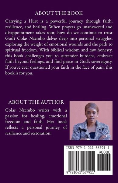 We all carry something - pain, regret, or a moment we never speak of. But what if the weight you have been holding isn't yours to carry forever? Are you struggling with unanswered prayers, disappointment, or the burden of emotional pain? Carrying A Hurt: From Burden to Freedom is a transformative Christian guide that leads you from spiritual discouragement to renewed strength in faith. Through deeply personal stories and biblical insights, this book explores how to overcome emotional wounds, deepen your prayer life, and embrace God's sovereignty even when life doesn't unfold the way you hoped. With wisdom rooted in scripture and written with raw honesty, Colas Nzembo gives a voice to those who have been silent, hope to the weary, and a path forward for anyone longing to break free. Discover how to: · Release past disappointments and find healing through faith. · Develop resilience in prayer, even when God seems silent. · Guard your mind against doubt and nurture unwavering trust. · Understand the power of surrender and grow spiritually through adversity. If you've ever felt discouraged in your walk with God, this book offers a fresh perspective on prayer, perseverance, and divine purpose. This isn't just a book, it's an invitation to bring your burdens before God and walk in the peace that surpasses all understanding. Let go of what weighs you down. Step into healing, clarity, and faith today. This book is intended for spiritual encouragement and personal reflection. Every effort has been made to present the content with care and sincerity. Perfect for spiritual growth, emotional healing, and a deeper connection with God.