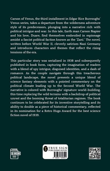 ""Carson of Venus"" is a thrilling science fiction novel by Edgar Rice Burroughs, known for its imaginative world-building and captivating adventure. The story follows the daring Earthman Carson Napier as he embarks on a journey to the mysterious planet Venus. Upon arrival, Carson discovers a lush and exotic landscape inhabited by strange creatures and alien civilizations. As he explores the wonders of Venus, Carson becomes embroiled in a series of daring escapades, including battles with fierce beasts, encounters with bizarre cultures, and quests for lost treasures. Along the way, Carson encounters allies and adversaries, including the beautiful princess Duare and the ruthless warlord Thorist. With its blend of action, romance, and intrigue, ""Carson of Venus"" transports readers to a world of thrilling adventure and daring exploration, where the spirit of discovery knows no bounds.
