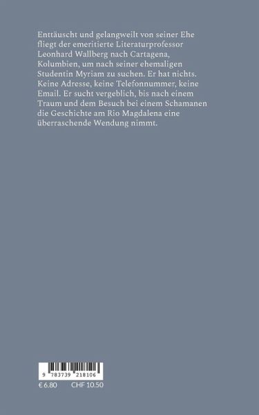 Enttäuscht und gelangweilt von seiner Ehe fliegt der emeritierte Literaturprofessor Leonhard Wallberg nach Cartagena, Kolumbien, um nach seiner ehemaligen Studentin Myriam zu suchen. Er hat nichts. Keine Adresse, keine Telefonnummer, keine Email. Er sucht vergeblich, bis nach einem Traum und dem Besuch bei einem Schamanen die Geschichte am Rio Magdalena eine überraschende Wendung nimmt.