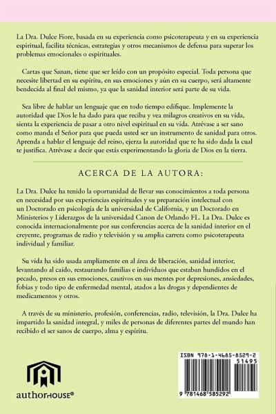 La Dra. Dulce Fiore, basada en su experiencia como psicoterapeuta y en su experiencia espiritual, facilita técnicas, estrategias y otros mecanismos de defensa para superar los problemas emocionales o espirituales. Cartas que Sanan, tiene que ser leído con un propósito especial. Toda persona que necesite libertad en su espíritu, en sus emociones y aún en su cuerpo, será altamente bendecida al final del mismo, ya que la sanidad interior será parte de su vida. Sea libre de hablar un lenguaje que en todo tiempo edifique. Implemente la autoridad que Dios le ha dado para que reciba y vea milagros creativos en su vida, sienta la experiencia de pasar a otro nivel espiritual en su vida. Atrévase a ser sano como manda el Señor para que pueda usted ser un instrumento de sanidad para otros. Aprenda a hablar el lenguaje del reino, ejerza la autoridad que te ha sido dada la cual te justifica. Atrévase a decir que estás experimentando la gloria de Dios en la tierra. (About the autor) Acerca de la autora: La Dra. Dulce ha tenido la oportunidad de llevar sus conocimientos a toda persona en necesidad por sus experiencias espirituales y su preparación intelectual con un Doctorado en psicología de la universidad de California, y un Doctorado en Ministerios y Liderazgos de la universidad Canon de Orlando FL. La Dra. Dulce es conocida internacionalmente por sus conferencias acerca de la sanidad interior en el creyente, programas de radio y televisión y su amplia carrera como psicoterapeuta individual y familiar. Su vida ha sido usada ampliamente en al área de liberación, sanidad interior, levantando al caído, restaurando familias e individuos que estaban hundidos en el pecado, presos en sus emociones, cautivos en sus mentes por depresiones, ansiedades, fobias y todo tipo de enfermedad mental, atados a las drogas y dependientes de medicamentos y otros. A través de su ministerio, profesión, conferencias, radio, televisión, la Dra. Dulce ha impartido la sanidad integral, y miles de personas de diferentes partes del mundo han recibido el ser sanos de cuerpo, alma y espíritu.