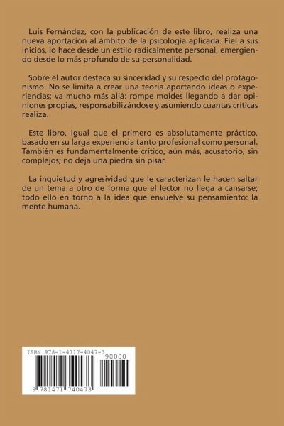 Luis Fernández, con la publicación de este libro, realiza una nueva aportación al ámbito de la psicología aplicada. Fiel a sus inicios, lo hace desde un estilo radicalmente personal, emergiendo desde lo más profundo de su personalidad. Sobre el autor destaca su sinceridad y su respecto del protagonismo. No se limita a crear una teoría aportando ideas o experiencias; va mucho más allá: rompe moldes llegando a dar opiniones propias, responsabilizándose y asumiendo cuantas críticas realiza. Este libro, igual que el primero es absolutamente práctico, basado en su larga experiencia tanto profesional como personal. También es fundamentalmente crítico, aún más, acusatorio, sin complejos; no deja una piedra sin pisar. La inquietud y agresividad que le caracterizan le hacen saltar de un tema a otro de forma que el lector no llega a cansarse; todo ello en torno a la idea que envuelve su pensamiento: la mente humana.