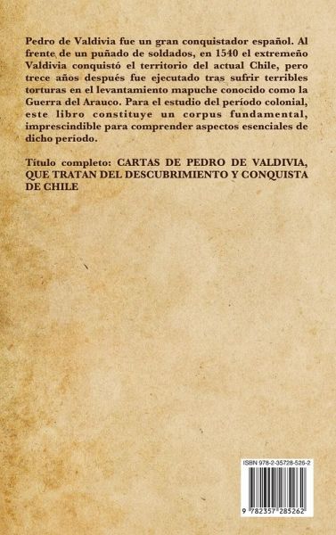 Pedro de Valdivia fue un gran conquistador español. Al frente de un puñado de soldados, en 1540 el extremeño Valdivia conquistó el territorio del actual Chile, pero trece años después fue ejecutado tras sufrir terribles torturas en el levantamiento mapuche conocido como la Guerra del Arauco. Para el estudio del período colonial, este libro constituye un corpus fundamental, imprescindible para comprender aspectos esenciales de dicho período. Título completo: Cartas de Pedro de Valdivia, que tratan del descubrimiento y conquista de Chile