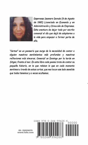 "Cartas" es un poemario que surge de la necesidad de contar a alguien nuestros sentimientos más profundos y nuestras reflexiones más sinceras. Comenzó un Domingo por la tarde en Sitges, frente al mar. En este libro cada poema trata de contar su pequeña historia, en la que relatan lo que en cada momento sentimos a través de estas cartas, que nos tocan ese lado sensible que todos tenemos y a veces ocultamos.
