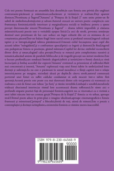Cele trei poeme formeaz¿ un ansamblu liric deosebit,în care femeia este privit¿ din unghiuri contrastante:p¿c¿toas¿ ¿i mântuitoare,seduc¿toare ¿i victim¿,vis ¿i realitate.De¿i aparent distincte,"Prostituata ¿i Îngerul","Amanta" ¿i "Prin¿esa de la Etajul 2" sunt unite printr-un fir subtil de simbolism,dorin¿¿,vin¿ ¿i salvare.Autorul creeaz¿ un univers poetic complex,în care frumuse¿ea feminin¿,tr¿irile interioare ¿i marginalizarea social¿ se întâlnesc pentru a spune pove¿ti dureroase,dar sincere."Prostituata ¿i Îngerul" drama iubirii imposibile ¿i c¿utarea mântuiriiAceast¿ poezie este o veritabil¿ epopee liric¿.Cu zeci de strofe, povestea urm¿re¿te destinul unei prostituate de lux care seduce un înger coborât din cer cu misiunea de a-i con¿tientiza p¿catul.Într-un balans fragil între sacrul ceresc ¿i profanul senzual,îngerul cedeaz¿ ispitei ¿i se întrup¿,alegând iubirea p¿mânteasc¿.Urmeaz¿ exilul lor,näterea unui copil din aceast¿ iubire "neîng¿duit¿",¿i o confruntare apocaliptic¿ cu îngerii ¿i demonii.În final,îngerul este pedepsit,iar femeia se poc¿ie¿te,g¿sind mântuire.Copilul lor devine simbolul reconcilierii dintre divin ¿i uman,alegând calea preo¿iei.Poezia se remarc¿ prin complexitatea narativ¿ ¿i tematic¿,aducând aminte de parabole biblice,dar ¿i de tragedii grece¿ti sau mituri moderne.Este o lucrare profund¿,care sondeaz¿ limitele alegerii,iubirii ¿i iert¿rii,într-o form¿ clasic¿,cu rim¿ încruci¿at¿ ¿i limbaj accesibil dar expresiv."Amanta" erotismul ca prizonierat al sufletului.Mult mai concentrat¿ ¿i intens¿, "Amanta" exploreaz¿ viäa unei femei iubite în umbr¿,tr¿ind între dorin¿¿ ¿i suferin¿¿.Ea nu este o p¿c¿toas¿ în sensul moralist,ci o fiin¿¿ captiv¿ într-o reläie interzis¿,mereu pe margine, niciodat¿ aleas¿ pe deplin.În câteva strofe,autorul contureaz¿ portretul unei femei cu suflet cald,dar condamnat s¿ ard¿ mocnit într-o iubire f¿r¿ speran¿¿.Aceast¿ poezie este poate cea mai dureroas¿ dintre cele trei,pentru c¿ rezoneaz¿ cu realitatea a mii de femei care iubesc "pe furi¿" ¿i r¿mân invizibile.Limbajul e sensibil,metaforele tr¿deaz¿ zbuciumul interior,iar ritmul lent accentueaz¿ drama sufleteasc¿.Se simte aici o profund¿ empatie poetic¿ fä¿ de personajul feminin,zugr¿vit nu ca vinovat¿,ci ca o victim¿ a unei iubiri n¿scute într-un context gre¿it."Prin¿esa de la Etajul 2" femeia ca vis urban, aproape ireal.Ultimul poem aduce în prim-plan o imagine idealizat¿,aproape cinematografic¿:o femeie frumoas¿ ¿i misterioas¿,"prin¿es¿" a blocului,dorit¿ de to¿i, atins¿ de nimeni.Este o poezie a contempläiei ¿i dorin¿ei neîmplinite,a misterului feminin ce r¿mâne mereu inaccesibil.