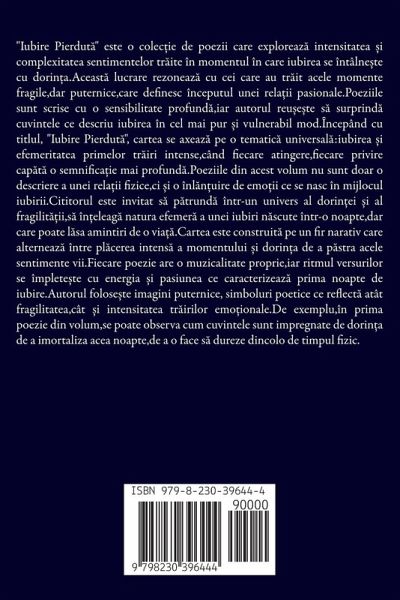 "Iubire Pierdut¿" este o colec¿ie de poezii care exploreaz¿ intensitatea ¿i complexitatea sentimentelor tr¿ite în momentul în care iubirea se întâlne¿te cu dorin¿a.Aceast¿ lucrare rezoneaz¿ cu cei care au tr¿it acele momente fragile,dar puternice,care definesc începutul unei reläii pasionale.Poeziile sunt scrise cu o sensibilitate profund¿,iar autorul reu¿e¿te s¿ surprind¿ cuvintele ce descriu iubirea în cel mai pur ¿i vulnerabil mod.Începând cu titlul, "Iubire Pierdut¿", cartea se axeaz¿ pe o tematic¿ universal¿:iubirea ¿i efemeritatea primelor tr¿iri intense,când fiecare atingere,fiecare privire cap¿t¿ o semnificäie mai profund¿.Poeziile din acest volum nu sunt doar o descriere a unei reläii fizice,ci ¿i o înl¿n¿uire de emöii ce se nasc în mijlocul iubirii.Cititorul este invitat s¿ p¿trund¿ într-un univers al dorin¿ei ¿i al fragilit¿¿ii,s¿ în¿eleag¿ natura efemer¿ a unei iubiri n¿scute într-o noapte,dar care poate l¿sa amintiri de o viä¿. Cartea este construit¿ pe un fir narativ care alterneaz¿ între pl¿cerea intens¿ a momentului ¿i dorin¿a de a p¿stra acele sentimente vii.Fiecare poezie are o muzicalitate proprie,iar ritmul versurilor se împlete¿te cu energia ¿i pasiunea ce caracterizeaz¿ prima noapte de iubire.Autorul folose¿te imagini puternice, simboluri poetice ce reflect¿ atât fragilitatea,cât ¿i intensitatea tr¿irilor emöionale.De exemplu,în prima poezie din volum,se poate observa cum cuvintele sunt impregnate de dorin¿a de a imortaliza acea noapte,de a o face s¿ dureze dincolo de timpul fizic.