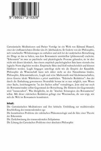 Cartesianische Meditationen und Pariser Vorträge ist ein Werk von Edmund Husserl, einer der einflussreichsten Denker des 20. Jahrhunderts. Er forderte von der Philosophie, sich vorschneller Weltdeutungen zu enthalten und sich bei der analytischen Betrachtung der Dinge an das zu halten, was dem Bewusstsein unmittelbar (phänomenal) erscheint. "Erkenntnis" ist zwar an psychische und physiologische Prozesse gebunden, sie ist aber nicht mit diesen identisch. Aus einem empirisch psychologischen Satz kann niemals eine logische Norm abgeleitet werden. Empirische Sätze sind bloß wahrscheinlich und können falsifiziert werden. Logik hingegen unterliegt nicht wie die Empirie der Kausalität. Philosophie als Wissenschaft kann sich daher nicht an den Naturalismus binden. Philosophie, Erkenntnistheorie, Logik und reine Mathematik sind Idealwissenschaften, deren Gesetze ideale Wahrheiten a priori ausdrücken. "Eidetische Reduktion": Aus der durch die Enthaltung gewonnenen Neutralität heraus ist es nun möglich, zum Wesen einer Sache, beziehungsweise "zu den Sachen selbst" vorzudringen. Jetzt sind nur noch die Bewusstseinsakte selbst Gegenstand der Betrachtung. Die Existenz des Gegenstandes wird "transzendiert". Was übrigbleibt, ist die "absolute Seinsregion des Bewusstseins" selbst. Mit dieser eidetischen Reduktion gelingt eine Wesensschau, die uns zeigt, wie sich die Welt im Bewusstsein konstituiert. Inhalt: - Die Cartesianischen Meditationen und ihre kritische Umbildung zur meditierenden Erschließung des transzendentalen ego - Die konstitutiven Probleme der eidetischen Phänomenologie und die Idee einer Theorie der Erkenntnis - Die Zurückweisung des transzendentalen Solipsismus - Die Lösung des Cartesischen Problems einer absoluten Philosophie