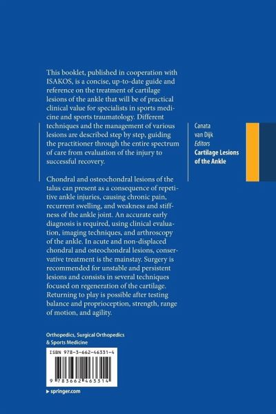 This booklet, published in cooperation with ISAKOS, is a concise, up-to-date guide and reference on the treatment of cartilage lesions of the ankle that will be of practical clinical value for specialists in sports medicine and sports traumatology. Different techniques and the management of various lesions are described step by step, guiding the practitioner through the entire spectrum of care from evaluation of the injury to successful recovery. Chondral and osteochondral lesions of the talus can present as a consequence of repetitive ankle injuries, causing chronic pain, recurrent swelling, and weakness and stiffness of the ankle joint. An accurate early diagnosis is required, using clinical evaluation, imaging techniques and arthroscopy of the ankle. In acute and non-displaced chondral and osteochondral lesions, conservative treatment is the mainstay. Surgery is recommended for unstable and persistent lesions and consists in several techniques focused on regeneration of the cartilage. Returning to play is possible after testing balance and proprioception, strength, range of motion, and agility.