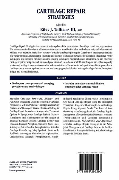 Cartilage Repair Strategies is a comprehensive update of the present state of cartilage repair and regeneration. The information in this volume addresses what methods are effective, what methods are safe, and what methods will lead to an alteration in the short history of articular cartilage injury repair. Contributors present examinations of a variety of topics including the structure and function of articular cartilage, the evaluation of cartilage repair techniques, and the latest cartilage sensitive imaging techniques. Several chapters anticipate new and emerging cartilage repair techniques - such as second generation ACI, resorbable scaffold-based repair, and arthroscopically performed cartilage transplantation - and include descriptions of the rationale and application of these procedures. Leading experts present updates on current and emerging methodologies, making Cartilage Repair Strategies a unique and essential reference.