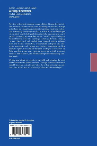 The Evolution of Cartilage Restoration.- The Osteochondral Unit: The Importance of the Underlying Subchondral Bone.- Imaging in Cartilage Restoration.- "A Unifying Theory" Treatment Algorithm for Cartilage Defects.- Osteochondritis Dissecans of the Knee.- Tibiofemoral Malalignment.- Meniscal Considerations in Cartilage Surgery.- Patholaxity (Ligamentous) Issues.- Patellofemoral Issues.- Staging and Practical Issues in Complex Cases.- Orthobiologics: Today and Tomorrow.- The Regulatory Environment for Emerging Cartilage Repair Technologies.- The Role of Stem Cells in Surgical Repair.- The Role of MSCs for non-surgical Treatment of OA.- Debridement.- Marrow Stimulation and Augmentation .- Augmented Marrow Stimulation for Cartilage Repair.- Osteochondral Autograft Transfer.- Osteochondral Allograft.- Perforated Allograft Cartilage.- Autologous Chondrocyte Implantation (ACI).- Arthroscopic Matrix-Induced Autologous Chondrocyte Implantation.- Particulated Cartilage Auto- and Allograft.- Cell-free scaffolds for the treatment of chondral and osteochondral lesions.- Osteotomy for Tibiofemoral Malalignment.- Patellofemoral Osteotomies.- Meniscal Allograft Transplantation Techniques.- Meniscal Augmentation and Replacement (Menaflex, Actifit, Nusurface).- Unloading devices.- Emerging technologies in cartilage repair.