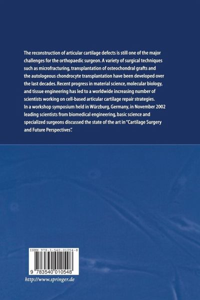 The reconstruction of articular cartilage defects is still one of the major challenges for the orthopaedic surgeon. A variety of surgical techniques such as microfracturing, transplantation of osteochondral grafts and the autologous chondrocyte transplantation have been developed over the last decades. Recent progress in material science and cell and tissue engineering has led to a worldwide increasing number of scientists working on cell-based articular cartilage repair strategies. In a workshop symposium held in Würzburg, Germany, in November 2002, leading scientists from biomedical engineering, basic science and specialized surgeons discussed the state of the art in "Cartilage Surgery and Future Perspectives".