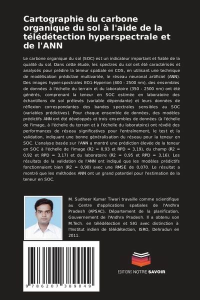 Le carbone organique du sol (SOC) est un indicateur important et fiable de la qualité du sol. Dans cette étude, les spectres du sol ont été caractérisés et analysés pour prédire la teneur spatiale en COS, en utilisant une technique de modélisation prédictive multivariée, le réseau neuronal artificiel (ANN). Des images hyper-spectrales EO1-Hyperion (400 - 2500 nm), des ensembles de données à l'échelle du terrain et du laboratoire (350 - 2500 nm) ont été générés, comprenant la teneur en SOC estimée en laboratoire des échantillons de sol prélevés (variable dépendante) et leurs données de réflexion correspondantes des bandes spectrales sensibles au SOC (variables prédictives). Pour chaque ensemble de données, des modèles prédictifs ANN ont été développés et trois ensembles de données (à l'échelle de l'image, à l'échelle du terrain et à l'échelle du laboratoire) ont révélé des performances de réseau significatives pour l'entraînement, le test et la validation, indiquant une bonne généralisation du réseau pour la teneur en SOC. L'analyse basée sur l'ANN a montré une prédiction élevée de la teneur en SOC à l'échelle de l'image (R2 = 0,93 et RPD = 3,19), du champ (R2 = 0,92 et RPD = 3,17) et du laboratoire (R2 = 0,95 et RPD = 3,16). Les résultats de la validation de l'ANN ont indiqué que les modèles prédictifs fonctionnaient bien (R2 = 0,90) avec une RMSE de 0,070. Le résultat a montré que les méthodes ANN ont un grand potentiel pour l'estimation de la teneur en SOC.