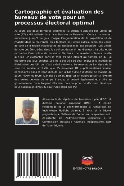 Au cours des deux dernières décennies, la structure actuelle des unités de vote (47) a été utilisée dans la métropole de Damaturu. Cette structure est maintenue jusqu'à ce jour malgré l'augmentation de la population et de l'habitat dans la métropole. Ces facteurs ont, entre autres, rendu les unités de vote de la région inadéquates ou inaccessibles aux électeurs. Les unités de vote ont été créées dans le seul but de servir les électeurs inscrits et de permettre l'inscription de nouveaux électeurs. Le résultat obtenu a révélé que les UP existantes dans la zone d'étude étaient au nombre de 47. La moyenne des plus proches voisins a été utilisée pour analyser le modèle de distribution des UP, qui s'est avéré aléatoire. Le résultat de l'analyse de la zone de service a révélé que 35 nouvelles UP supplémentaires étaient nécessaires dans la zone d'étude sur la base d'une distance de marche de 200m, 400m et 600m. L'analyse devrait apporter un éclairage sur la révision des unités de vote de temps à autre, et devrait également être utile au gouvernement ou à l'organe électoral pour la prise de décision, ainsi que pour l'utilisation d'ArcGIS pour l'utilisation des PU.