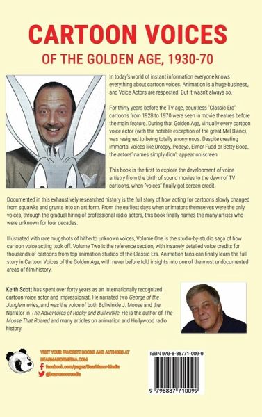 Cartoon voicesof the golden age, 1930-70 In today's world of instant information everyone knows everything about cartoon voices. Animation is a huge business, and Voice Actors are respected. But it wasn't always so. For thirty years before the TV age, countless "Classic Era" cartoons from 1928 to 1970 were seen in movie theatres before the main feature. During that Golden Age, virtually every cartoon voice actor (with the notable exception of the great Mel Blanc), was resigned to being totally anonymous. Despite creating immortal voices like Droopy, Popeye, Elmer Fudd or Betty Boop, the actors' names simply didn't appear on screen. This book is the first to explore the development of voice artistry from the birth of sound movies to the dawn of TV cartoons, when "voices" finally got screen credit. Documented in this exhaustively researched history is the full story of how acting for cartoons slowly changed from squawks and grunts into an art form. From the earliest days when animators themselves were the only voices, through the gradual hiring of professional radio actors, this book finally names the many artists who were unknown for four decades. Illustrated with rare mugshots of hitherto unknown voices, Volume One is the studio-by-studio saga of how cartoon voice acting took off. Volume Two is the reference section, with insanely detailed voice credits for thousands of cartoons from top animation studios of the Classic Era. Animation fans can finally learn the full story in Cartoon Voices of the Golden Age, with never before told insights into one of the most undocumented areas of film history. Keith Scott has spent over forty years as an internationally recognized cartoon voice actor and impressionist. He narrated two George of the Jungle movies, and was the voice of both Bullwinkle J. Moose and the Narrator in The Adventures of Rocky and Bullwinkle. He is the author of The Moose That Roared and many articles on animation and Hollywood radio history.