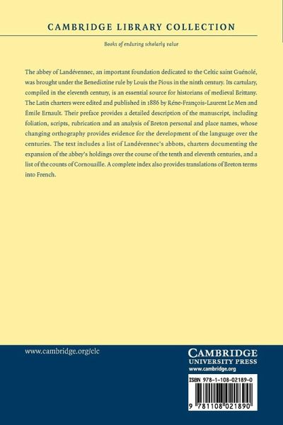The abbey of Landévennec, an important foundation dedicated to the Celtic saint Guénolé, was brought under the Benedictine rule by Louis the Pious in the ninth century. Its cartulary, compiled in the eleventh century, is an essential source for historians of medieval Brittany. The Latin charters were edited and published in 1886 by Réne-François-Laurent Le Men and Émile Ernault. Their preface provides a detailed description of the manuscript, including foliation, scripts, rubrication and an analysis of Breton personal and place names, whose changing orthography provides evidence for the development of the language over the centuries. The text includes a list of Landévennec's abbots, charters documenting the expansion of the abbey's holdings over the course of the tenth and eleventh centuries, and a list of the counts of Cornouaille. A complete index also provides translations of Breton terms into French.