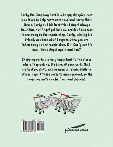 Carty the Shopping Cart is a happy shopping cart who loves to help customers shop and carry their items. Carty and his best friend Angel always have fun, but Angel got into an accident and was taken away to the repair shop. Carty, missing his friend, wonders what happens when you are taken away to the repair shop. Will Carty see his best friend Angel again and how? Shopping carts are very important to the stores where they belong. We have all seen Broken, Dirty, Squeaky wheels, and shopping carts that move in all directions when pushed forward. While in stores, report these carts to management so the shopping carts can be fixed and cleaned.