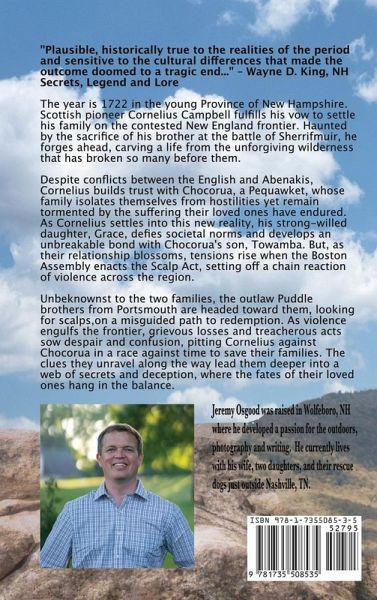 The year is 1722 in the young Province of New Hampshire. Scottish pioneer Cornelius Campbell fulfills his vow to settle his family on the contested New England frontier. Haunted by the sacrifice of his brother at the battle of Sherrifmuir, he forges ahead, carving a life from the unforgiving wilderness that has broken so many before them. Despite conflicts between the English and Abenakis, Cornelius builds trust with Chocorua, a Pequawket, whose family isolates themselves from hostilities yet remain tormented by the suffering their loved ones have endured. As Cornelius settles into this new reality, his strong-willed daughter, Grace, defies societal norms and develops an unbreakable bond with Chocorua's son, Towamba. But, as their relationship blossoms, tensions rise when the Boston Assembly enacts the Scalp Act, setting off a chain reaction of violence across the region. Unbeknownst to the two families, the outlaw Puddle brothers from Portsmouth are headed toward them, looking for scalps, on a misguided path to redemption. As violence engulfs the frontier, grievous losses and treacherous acts sow despair and confusion, pitting Cornelius against Chocorua in a race against time to save their families. The clues they unravel along the way lead them deeper into a web of secrets and deception, where the fates of their loved ones hang in the balance.