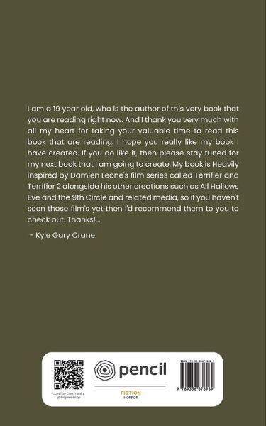 I am a 19 year old, who is the author of this very book that you are reading right now. And I thank you very much with all my heart for taking your valuable time to read this book that are reading. I hope you really like my book I have created. If you do like it, then please stay tuned for my next book that I am going to create. My book is Heavily inspired by Damien Leone's film series called Terrifier and Terrifier 2 alongside his other creations such as All Hallows Eve and the 9th Circle and related media, so if you haven't seen those film's yet then I'd recommend them to you to check out. Thanks!... - Kyle Gary Crane