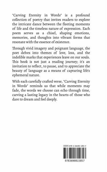 "Carving Eternity in Words" is a profound collection of poetry that invites readers to explore the intricate dance between the fleeting moments of life and the timeless nature of expression. Each poem serves as a chisel, shaping emotions, memories, and thoughts into vibrant forms that resonate with the essence of existence. Through vivid imagery and poignant language, the poet delves into themes of love, loss, and the indelible marks that experiences leave on our souls. This book is not just a reading journey; it's an invitation to reflect, to pause, and to appreciate the beauty of language as a means of capturing life's ephemeral nature. With each carefully crafted verse, "Carving Eternity in Words" reminds us that while moments may fade, the words we choose can echo through time, carving a lasting legacy in the hearts of those who dare to dream and feel deeply.