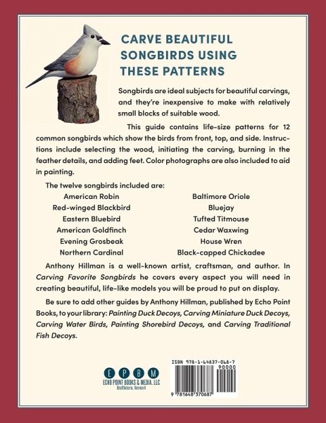 Carve Beautiful Songbirds Using These Patterns Songbirds are ideal subjects for beautiful carvings, and they're inexpensive to make with relatively small blocks of suitable wood. This guide contains life-size patterns for 12 common songbirds which show the birds from front, top, and side. Instructions for selecting the wood, initiating the carving, burning in the feather details, and adding feet. Color photographs are also included to aid in painting. The twelve songbirds included are: American robin Red-winged blackbird Eastern bluebird American goldfinch Evening grosbeak Northern cardinal Baltimore oriole Bluejay Tuft titmouse Cedar waxwing House wren Black-capped chickadee Anthony Hillman is a well-known artist, craftsman, and author. In Carving Favorite Songbirds he covers every aspect you will need in creating beautiful, life-like models you will be proud to put on display. Be sure to add other guides by Anthony Hillman, published by Echo Point Books, to your library: Painting Duck Decoys, Carving Miniature Duck Decoys, Carving Water Birds, Painting Shorebird Decoys, and Carving Traditional Fish Decoys.