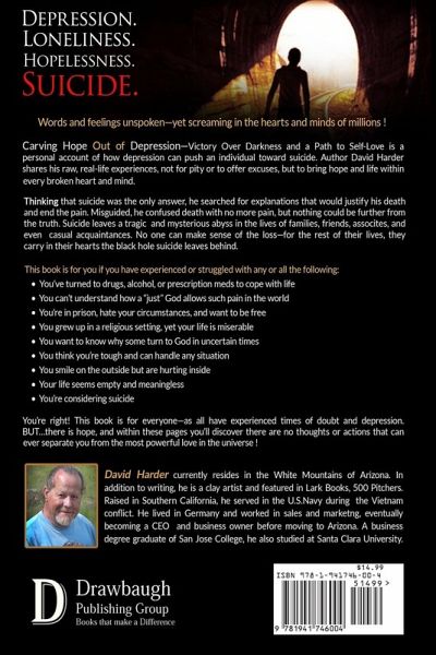 DEPRESSION ¿ LONELINESS ¿ HOPELESSNESS ¿ SUICIDE Words and feelings unspoken-yet screaming in the hearts and minds of millions! Carving Hope Out of Depression-Victory Over Darkness and a Path to Self-Love is a personal account of how depression can push an individual toward suicide. Author David Harder shares his raw, real-life experiences, not for pity or to offer excuses, but to bring hope and life within every broken heart and mind. Thinking that suicide was the only answer, he searched for explanations that would justify his death and end the pain. Misguided, he confused death with no more pain, but nothing could be further from the truth. Suicide leaves a tragic and mysterious abyss in the lives of families, friends, associates, and even casual acquaintances. No one can make sense of the loss-for the rest of their lives; they carry in their hearts the black hole suicide leaves behind. This book is for you if you have experienced or struggled with any or all the following: ¿ You've turned to drugs, alcohol, or prescription meds to cope with life ¿ You can't understand how a "just" God allows such pain in the world ¿ You're in prison, hate your circumstances, and want to be free ¿ You grew up in a religious setting, yet your life is miserable ¿ You want to know why some turn to God in uncertain times ¿ You think you're tough and can handle any situation ¿ You smile on the outside but are hurting inside ¿ Your life seems empty and meaningless ¿ You're considering suicide You're right! This book is for everyone-as all have experienced times of doubt and depression. BUT...there is hope, and within these pages you'll discover there are no thoughts or actions that can ever separate you from the most powerful love in the universe!