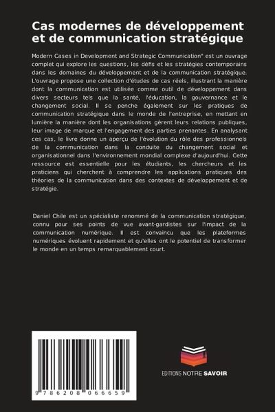 Modern Cases in Development and Strategic Communication" est un ouvrage complet qui explore les questions, les défis et les stratégies contemporains dans les domaines du développement et de la communication stratégique. L'ouvrage propose une collection d'études de cas réels, illustrant la manière dont la communication est utilisée comme outil de développement dans divers secteurs tels que la santé, l'éducation, la gouvernance et le changement social. Il se penche également sur les pratiques de communication stratégique dans le monde de l'entreprise, en mettant en lumière la manière dont les organisations gèrent leurs relations publiques, leur image de marque et l'engagement des parties prenantes. En analysant ces cas, le livre donne un aperçu de l'évolution du rôle des professionnels de la communication dans la conduite du changement social et organisationnel dans l'environnement mondial complexe d'aujourd'hui. Cette ressource est essentielle pour les étudiants, les chercheurs et les praticiens qui cherchent à comprendre les applications pratiques des théories de la communication dans des contextes de développement et de stratégie.
