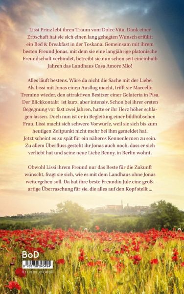 Lissi Prinz lebt ihren Traum vom Dolce Vita. Dank einer Erbschaft hat sie sich einen lang gehegten Wunsch erfüllt: ein Bed & Breakfast in der Toskana. Gemeinsam mit ihrem besten Freund Jonas, mit dem sie eine langjährige platonische Freundschaft verbindet, betreibt sie nun schon seit eineinhalb Jahren das Landhaus Casa Amore Mio!Alles läuft bestens. Wäre da nicht die Sache mit der Liebe. Als Lissi mit Jonas einen Ausflug macht, trifft sie Marcello Tremino wieder, den attraktiven Besitzer einer Gelateria in Pisa. Der Blickkontakt ist kurz, aber intensiv. Schon bei ihrer ersten Begegnung vor fast zwei Jahren, hatte er ihr Herz höher schlagen lassen. Doch nun ist er in Begleitung einer bildhübschen Frau. Lissi macht sich schwere Vorwürfe, weil sie sich bis zum heutigen Zeitpunkt nicht mehr bei ihm gemeldet hat. Jetzt scheint es zu spät für ein näheres Kennenlernen zu sein. Zu allem Überfluss gesteht ihr Jonas auch noch, dass er sich verliebt hat und seine neue Liebe Benny, in Berlin wohnt.Obwohl Lissi ihrem Freund nur das Beste für die Zukunft wünscht, fragt sie sich, wie es mit dem Landhaus ohne Jonas weitergehen soll. Da hat ihre beste Freundin Jule eine großartige Überraschung für sie, die alles auf den Kopf stellt ...