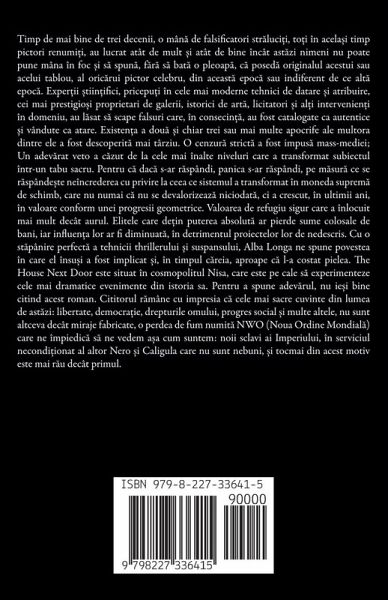 Timp de mai bine de trei decenii, o mân¿ de falsificatori str¿luci¿i, to¿i în aceläi timp pictori renumi¿i, au lucrat atât de mult ¿i atât de bine încât ast¿zi nimeni nu poate pune mâna în foc ¿i s¿ spun¿, f¿r¿ s¿ bat¿ o pleoap¿, c¿ posed¿ originalul acestui sau acelui tablou, al oric¿rui pictor celebru, din aceast¿ epoc¿ sau indiferent de ce alt¿ epoc¿. Exper¿ii ¿tiin¿ifici, pricepu¿i în cele mai moderne tehnici de datare ¿i atribuire, cei mai prestigio¿i proprietari de galerii, istorici de art¿, licitatori ¿i al¿i intervenien¿i în domeniu, au l¿sat s¿ scape falsuri care, în consecin¿¿, au fost catalogate ca autentice ¿i vândute ca atare. Existen¿a a dou¿ ¿i chiar trei sau mai multe apocrife ale multora dintre ele a fost descoperit¿ mai târziu. O cenzur¿ strict¿ a fost impus¿ mass-mediei; Un adev¿rat veto a c¿zut de la cele mai înalte niveluri care a transformat subiectul într-un tabu sacru. Pentru c¿ dac¿ s-ar r¿spândi, panica s-ar r¿spândi, pe m¿sur¿ ce se r¿spânde¿te neîncrederea cu privire la ceea ce sistemul a transformat în moneda suprem¿ de schimb, care nu numai c¿ nu se devalorizeaz¿ niciodat¿, ci a crescut, în ultimii ani, în valoare conform unei progresii geometrice. Valoarea de refugiu sigur care a înlocuit mai mult decât aurul. Elitele care de¿in puterea absolut¿ ar pierde sume colosale de bani, iar influen¿a lor ar fi diminuat¿, în detrimentul proiectelor lor de nedescris. Cu o st¿pânire perfect¿ a tehnicii thrillerului ¿i suspansului, Alba Longa ne spune povestea în care el însu¿i a fost implicat ¿i, în timpul c¿reia, aproape c¿ l-a costat pielea. The House Next Door este situat în cosmopolitul Nisa, care este pe cale s¿ experimenteze cele mai dramatice evenimente din istoria sa. Pentru a spune adev¿rul, nu ie¿i bine citind acest roman. Cititorul r¿mâne cu impresia c¿ cele mai sacre cuvinte din lumea de ast¿zi: libertate, democräie, drepturile omului, progres social ¿i multe altele, nu sunt altceva decât miraje fabricate, o perdea de fum numit¿ NWO (Noua Ordine Mondial¿) care ne împiedic¿ s¿ ne vedem äa cum suntem: noii sclavi ai Imperiului, în serviciul necondi¿ionat al altor Nero ¿i Caligula care nu sunt nebuni, ¿i tocmai din acest motiv este mai r¿u decât primul.