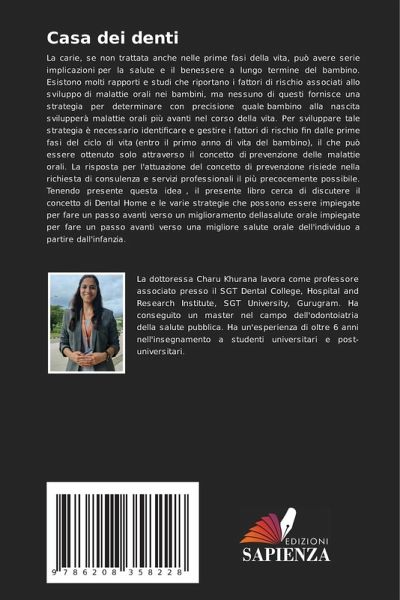 La carie, se non trattata anche nelle prime fasi della vita, può avere serie implicazioni per la salute e il benessere a lungo termine del bambino. Esistono molti rapporti e studi che riportano i fattori di rischio associati allo sviluppo di malattie orali nei bambini, ma nessuno di questi fornisce una strategia per determinare con precisione quale bambino alla nascita svilupperà malattie orali più avanti nel corso della vita. Per sviluppare tale strategia è necessario identificare e gestire i fattori di rischio fin dalle prime fasi del ciclo di vita (entro il primo anno di vita del bambino), il che può essere ottenuto solo attraverso il concetto di prevenzione delle malattie orali. La risposta per l'attuazione del concetto di prevenzione risiede nella richiesta di consulenza e servizi professionali il più precocemente possibile. Tenendo presente questa idea , il presente libro cerca di discutere il concetto di Dental Home e le varie strategie che possono essere impiegate per fare un passo avanti verso un miglioramento dellasalute orale impiegate per fare un passo avanti verso una migliore salute orale dell'individuo a partire dall'infanzia.