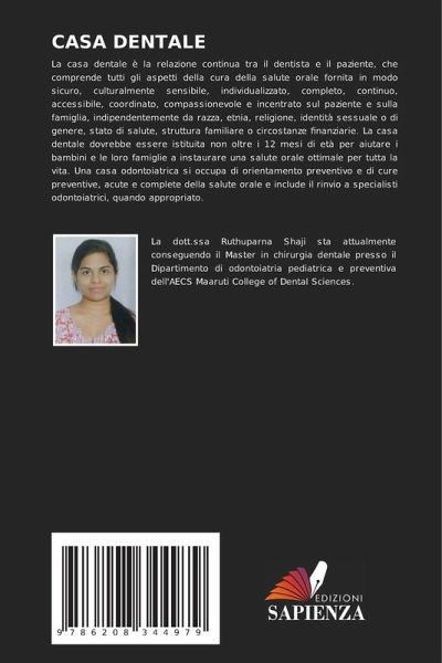 La casa dentale è la relazione continua tra il dentista e il paziente, che comprende tutti gli aspetti della cura della salute orale fornita in modo sicuro, culturalmente sensibile, individualizzato, completo, continuo, accessibile, coordinato, compassionevole e incentrato sul paziente e sulla famiglia, indipendentemente da razza, etnia, religione, identità sessuale o di genere, stato di salute, struttura familiare o circostanze finanziarie. La casa dentale dovrebbe essere istituita non oltre i 12 mesi di età per aiutare i bambini e le loro famiglie a instaurare una salute orale ottimale per tutta la vita. Una casa odontoiatrica si occupa di orientamento preventivo e di cure preventive, acute e complete della salute orale e include il rinvio a specialisti odontoiatrici, quando appropriato.