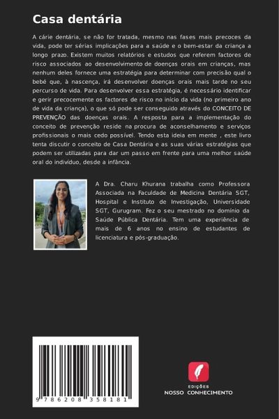 A cárie dentária, se não for tratada, mesmo nas fases mais precoces da vida, pode ter sérias implicações para a saúde e o bem-estar da criança a longo prazo. Existem muitos relatórios e estudos que referem factores de risco associados ao desenvolvimento de doenças orais em crianças, mas nenhum deles fornece uma estratégia para determinar com precisão qual o bebé que, à nascença, irá desenvolver doenças orais mais tarde no seu percurso de vida. Para desenvolver essa estratégia, é necessário identificar e gerir precocemente os factores de risco no início da vida (no primeiro ano de vida da criança), o que só pode ser conseguido através do CONCEITO DE PREVENÇÃO das doenças orais. A resposta para a implementação do conceito de prevenção reside na procura de aconselhamento e serviços profissionais o mais cedo possível. Tendo esta ideia em mente , este livro tenta discutir o conceito de Casa Dentária e as suas várias estratégias que podem ser utilizadas para dar um passo em frente para uma melhor saúde oral do indivíduo, desde a infância.