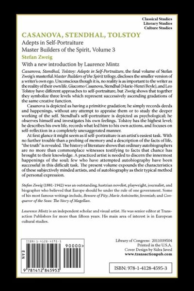 Casanova, Stendhal, Tolstoy: Adepts in Self-Portraiture, the final volume of Stefan Zweig's masterful Master Builders of the Spirit trilogy, discloses the smaller version of a writer's own ego. Unconscious though it is, no reality is as important to the writer as the reality of their own life. Giacomo Casanova, Stendhal (Marie-Henri Beyle), and Leo Tolstoy have different approaches to self-portraiture, but Zweig shows that together they symbolize three levels which represent successively ascending gradations of the same creative function. Casanova is depicted as having a primitive gradation; he simply records deeds and happenings, without any attempt to appraise them or to study the deeper working of the self. Stendhal's self-portraiture is depicted as psychological; he observes himself and investigates his own feelings. Tolstoy has the highest level; he describes his own life, records what led him to his own actions, and focuses on self-reflection in a completely unexaggerated manner. At first glance it might seem as if self-portraiture is an artist's easiest task. With no further trouble than a probing of memory and a description of the facts of life, "the truth" is revealed. The history of literature shows that ordinary autobiographers are no more than commonplace witnesses testifying to facts that chance has brought to their knowledge. A practiced artist is needed to discern the innermost happenings of the soul; few who have attempted autobiography have been successful in this difficult task. The present volume expounds the characteristics of these subjectively minded artists, and of autobiography as their typical method of personal expression.