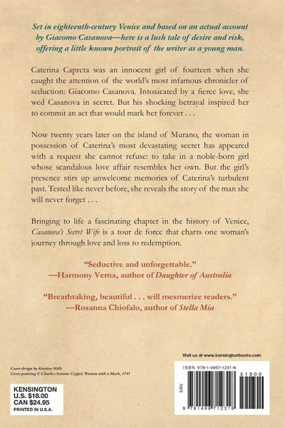"Full of passion and rich historical detail . . . an enthralling read, impossible to put down." -Phyllis T. Smith, bestselling author of I Am Livia and The Daughters of Palatine Hill "This is Venice beneath the mask: A dark and fascinating love story hiding in the shadows of the golden city." -Marina Fiorato, bestselling author of The Glassblower of Murano Set in eighteenth-century Venice and based on an actual account by Giacomo Casanova-here is a lush tale of desire and risk, offering a little known portrait of the writer as a young man. Caterina Capreta was an innocent girl of fourteen when she caught the attention of the world's most infamous chronicler of seduction: Giacomo Casanova. Intoxicated by a fierce love, she wed Casanova in secret. But his shocking betrayal inspired her to commit an act that would mark her forever . . . Now twenty years later on the island of Murano, the woman in possession of Caterina's most devastating secret has appeared with a request she cannot refuse: to take in a noble-born girl whose scandalous love affair resembles her own. But the girl's presence stirs up unwelcome memories of Caterina's turbulent past. Tested like never before, she reveals the story of the man she will never forget . . . Bringing to life a fascinating chapter in the history of Venice, Casanova's Secret Wife is a tour de force that charts one woman's journey through love and loss to redemption. "Seductive and unforgettable" -Harmony Verna, author of Daughter of Australia "Breathtaking, beautiful . . . will mesmerize readers." -Rosanna Chiofalo, author of Stella Mia