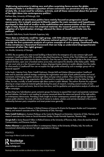 In this book, Caterina Froio, Pietro Castelli Gattinara, Giorgia Bulli and Matteo Albanese explore CasaPound Italia and its particular political strategy combining the organization and style of both political parties and social movements and bringing together extreme-rightideas and pop-culture symbols. They contend that this strategy of hybridization allowed a fringe organization like CasaPound to consolidate its position within the Italian far-right milieu, but also, crucially, to make extreme-right ideas routine in public debates. The authors illustrate this argument drawing on unique empirical material gathered during five years of research, including several months of overt observation at concerts and events, face-to-face interviews, and the qualitative and quantitative analysis of online and offline campaigns.