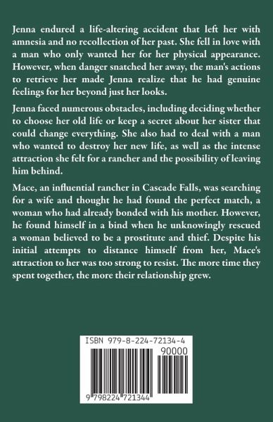 Jenna endured a life-altering accident that left her with amnesia and no recollection of her past. She fell in love with a man who only wanted her for her physical appearance. However, when danger snatched her away, the man's actions to retrieve her made Jenna realize that he had genuine feelings for her beyond just her looks. Jenna faced numerous obstacles, including deciding whether to choose her old life or keep a secret about her sister that could change everything. She also had to deal with a man who wanted to destroy her new life, as well as the intense attraction she felt for a rancher and the possibility of leaving him behind. Mace, an influential rancher in Cascade Falls, was searching for a wife and thought he had found the perfect match, a woman who had already bonded with his mother. However, he found himself in a bind when he unknowingly rescued a woman believed to be a prostitute and thief. Despite his initial attempts to distance himself from her, Mace's attraction to her was too strong to resist. The more time they spent together, the more their relationship grew.