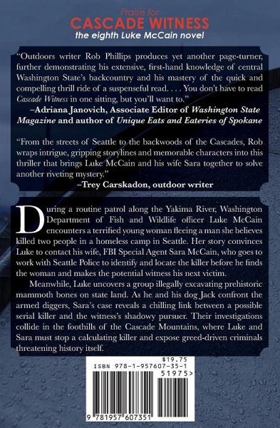 During a routine patrol along the Yakima River, Washington Department of Fish and Wildlife officer Luke McCain encounters a terrified young woman fleeing a man she believes killed two people in a homeless camp in Seattle. Her story convinces Luke to contact his wife, FBI Special Agent Sara McCain, who goes to work with Seattle Police to identify and locate the killer before he finds the woman and makes the potential witness his next victim. ¿ Meanwhile, Luke uncovers a group illegally excavating prehistoric mammoth bones on state land. As he and his dog Jack confront the armed diggers, Sara's case reveals a chilling link between a possible serial killer and the witness's shadowy pursuer. Their investigations collide in the foothills of the Cascade Mountains, where Luke and Sara must stop a calculating killer and expose greed-driven criminals threatening history itself. Praise for Cascade Witness: "Outdoors writer Rob Phillips produces yet another page-turner, further demonstrating his extensive, first-hand knowledge of central Washington State's backcountry and his mastery of the quick and compelling thrill ride of a suspenseful read. . . . You don't have to read Cascade Witness in one sitting, but you'll want to." --Adriana Janovich, Associate Editor of Washington State Magazine and author of Unique Eats and Eateries of Spokane "From the streets of Seattle to the backwoods of the Cascades, Rob wraps intrigue, gripping storylines and memorable characters into this thriller that brings Luke McCain and his wife Sara together to solve another riveting mystery. --Trey Carskadon, outdoor writer