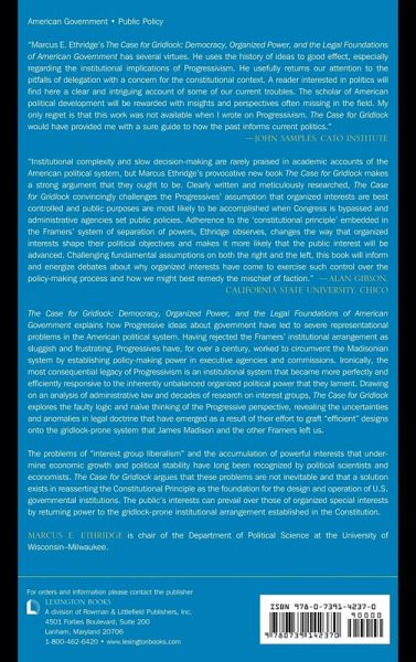 The Case for Gridlock explains how, in an effort to make the system more egalitarian and forward thinking, American Progressivism led to the creation of government institutions that increased the political advantages of superior organization, thereby enabling "special interests" to dominate the policy process. The book makes the case for the Constitutional Principle, showing how gridlock-prone institutions lead to better representation of broader interests.