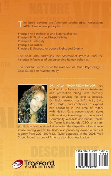 The book governs the American psychological Association (APA), five general principles: Principle A: Beneficence and Nonmaleficence Principle B: Fidelity and Responsibility Principle C: Integrity Principle D: Justice Principle E: Respect for people Rights and Dignity The book also addresses the Assessment Process, and the historical influences of understanding human behavior. The book further describes the evolution of Health Psychology & Case Studies on Psychotherapy.
