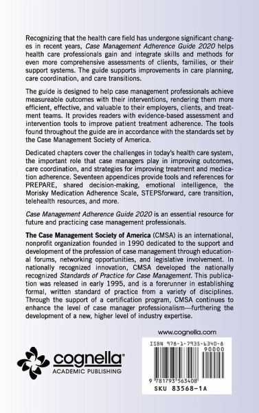 Recognizing that the health care field has undergone significant changes in recent years, Case Management Adherence Guide 2020 helps health care professionals gain and integrate skills and methods for even more comprehensive assessments of clients, families, or their support systems. The guide supports improvements in care planning, care coordination, and care transitions. The guide is designed to help case management professionals achieve measureable outcomes with their interventions, rendering them more efficient, effective, and valuable to their employers, clients, and treatment teams. It provides readers with evidence-based assessment and intervention tools to improve patient treatment adherence. The tools found throughout the guide are in accordance with the standards set by the Case Management Society of America. Dedicated chapters cover the challenges in today's health care system, the important role that case managers play in improving outcomes, care coordination, and strategies for improving treatment and medication adherence. Seventeen appendices provide tools and references for PREPARE, shared decision-making, emotional intelligence, the Morisky Medication Adherence Scale, STEPSforward, care transition, telehealth resources, and more. Case Management Adherence Guide 2020 is an essential resource for future and practicing case management professionals.