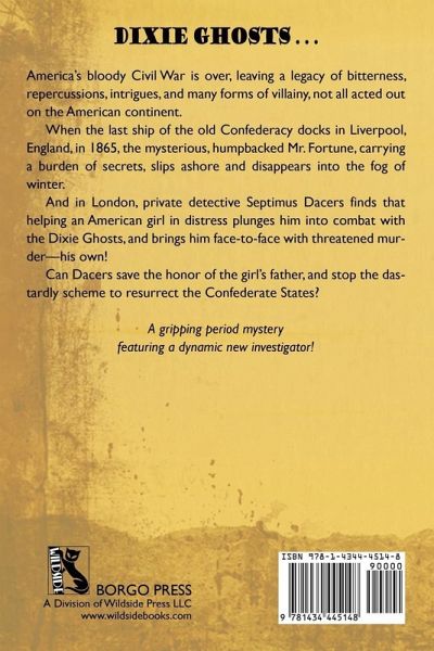 America's bloody Civil War is over, leaving a legacy of bitterness, repercussions, intrigues, and many forms of villainy, not all acted out on the American continent. When the last ship of the old Confederacy docks in Liverpool, England, in 1865, the mysterious, humpbacked Mr. Fortune, carrying a burden of secrets, slips ashore and disappears into the fog of winter. And in London, private detective Septimus Dacers finds that helping an American girl in distress plunges him into combat with the Dixie Ghosts, and brings him face-to-face with threatened murder--his own! Can Dacers save the honor of the girl's father, and stop the dastardly scheme to resurrect the Confederate States? A gripping period mystery featuring a dynamic new investigator!