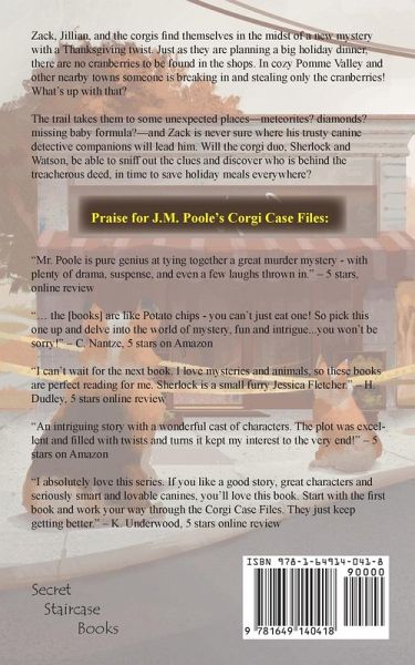 Readers are loving this cozy mystery series with its two indomitable dog sleuths. Zack, Jillian and the corgis, Sherlock and Watson, are at it again in this delightful series that pulls you right in. Zack, Jillian, and the corgis find themselves in the midst of a new mystery with a Thanksgiving twist. Just as they are planning a big holiday dinner, there are no cranberries to be found in the shops. In cozy Pomme Valley and other nearby towns someone is breaking in and stealing only the cranberries! What's up with that? The trail takes them to some unexpected places-meteorites? diamonds? missing baby formula?-and Zack is never sure where his trusty canine detective companions will lead him. Will the corgi duo, Sherlock and Watson, be able to sniff out the clues and discover who is behind the treacherous deed, in time to save holiday meals everywhere? Praise for Jeffrey Poole and the Corgi Case files: "Mr. Poole is pure genius at tying together a great murder mystery - with plenty of drama, suspense, and even a few laughs thrown in." - 5 stars, online review "... the [books] are like Potato chips - you can't just eat one! So pick this one up and delve into the world of mystery, fun and intrigue...you won't be sorry!" - C. Nantz, 5 stars on Amazon "I can't wait for the next book. I love mysteries and animals, so these books are perfect reading for me. Sherlock is a small furry Jessica Fletcher." - H. Dudley, 5 stars online review "The best thing--this guy loves the corgis, as I do, and he describes their behavior very well. Looking forward to future stories." - 5 stars, Amazon "An intriguing story with a wonderful cast of characters. The plot was excellent and filled with twists and turns it kept my interest to the very end!" - 5 stars on Amazon "I absolutely love this series. If you like a good story, great characters and seriously smart and lovable canines, you'll love this book. Start with the first book and work your way through the Corgi Case Files. They just keep getting better." - K. Underwood, 5 stars online review "Love love love this series!!! One of my favorites, the characters are fun and real. But of course Sherlock and Watson are the best, who wouldn't want corgis like them! Can't wait for the next book!" - C. Woody, 5 stars, Amazon