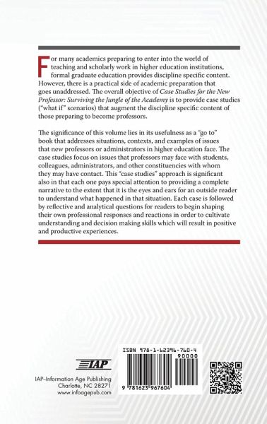 A volume in Innovative Perspectives of Higher Education: Research, Theory and Practice Series Editor Kathleen P. King, University of South Florida For many academics preparing to enter into the world of teaching and scholarly work in higher education institutions, formal graduate education provides discipline specific content. However, there is a practical side of academic preparation that goes unaddressed. The overall objective of Case Studies for the New Professor: Surviving the Jungle of the Academy is to provide case studies ("what if" scenarios) that augment the discipline specific content of those preparing to become professors. The significance of this volume lies in its usefulness as a "go to" book that addresses situations, contexts, and examples of issues that new professors or administrators in higher education face. The case studies focus on issues that professors may face with students, colleagues, administrators, and other constituencies with whom they may have contact. This "case studies" approach is significant also in that each one pays special attention to providing a complete narrative to the extent that it is the eyes and ears for an outside reader to understand what happened in that situation. Each case is followed by reflective and analytical questions for readers to begin shaping their own professional responses and reactions in order to cultivate understanding and decision making skills which will result in positive and productive experiences.