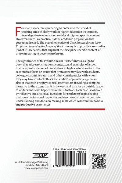 A volume in Innovative Perspectives of Higher Education: Research, Theory and Practice Series Editor Kathleen P. King, University of South Florida For many academics preparing to enter into the world of teaching and scholarly work in higher education institutions, formal graduate education provides discipline specific content. However, there is a practical side of academic preparation that goes unaddressed. The overall objective of Case Studies for the New Professor: Surviving the Jungle of the Academy is to provide case studies ("what if" scenarios) that augment the discipline specific content of those preparing to become professors. The significance of this volume lies in its usefulness as a "go to" book that addresses situations, contexts, and examples of issues that new professors or administrators in higher education face. The case studies focus on issues that professors may face with students, colleagues, administrators, and other constituencies with whom they may have contact. This "case studies" approach is significant also in that each one pays special attention to providing a complete narrative to the extent that it is the eyes and ears for an outside reader to understand what happened in that situation. Each case is followed by reflective and analytical questions for readers to begin shaping their own professional responses and reactions in order to cultivate understanding and decision making skills which will result in positive and productive experiences.